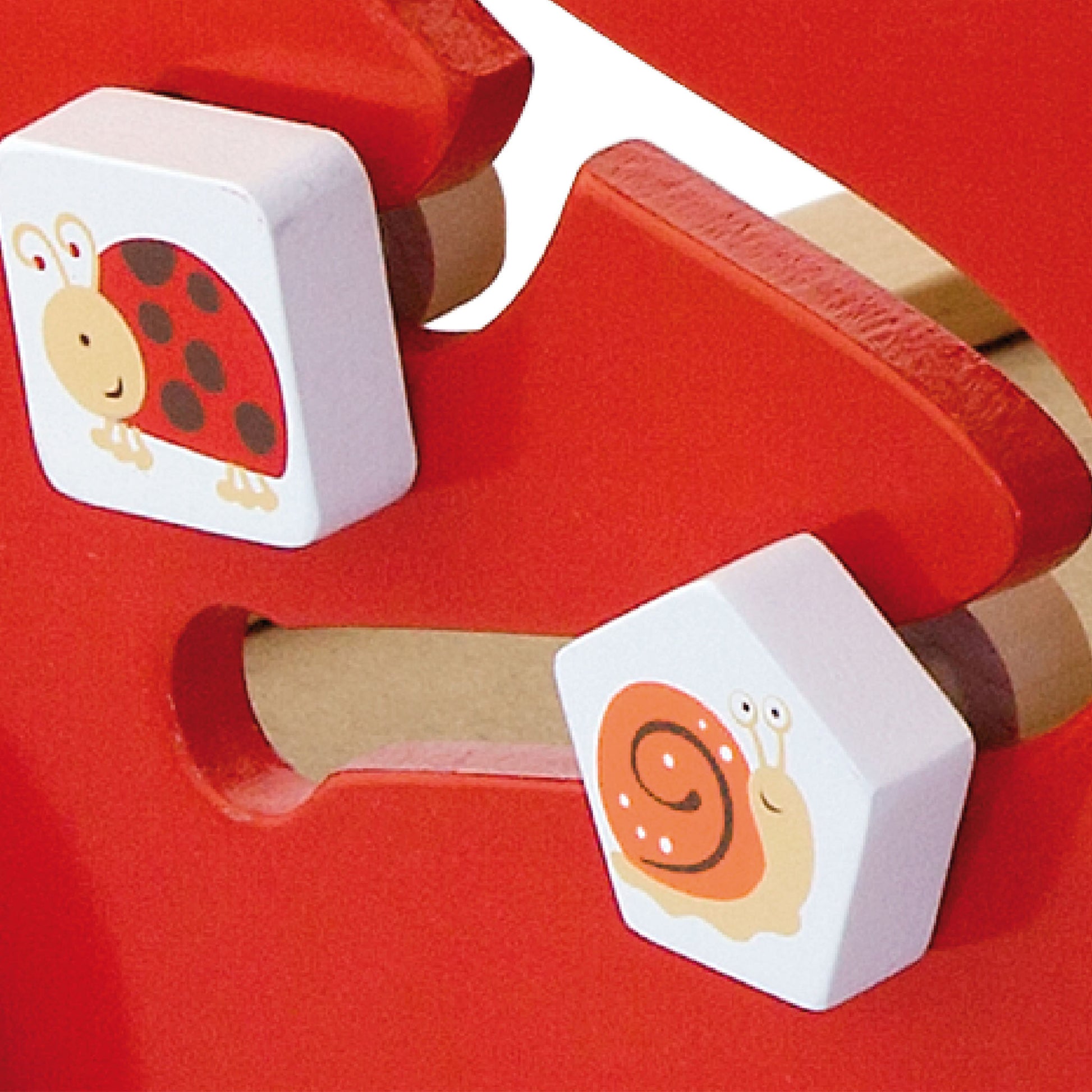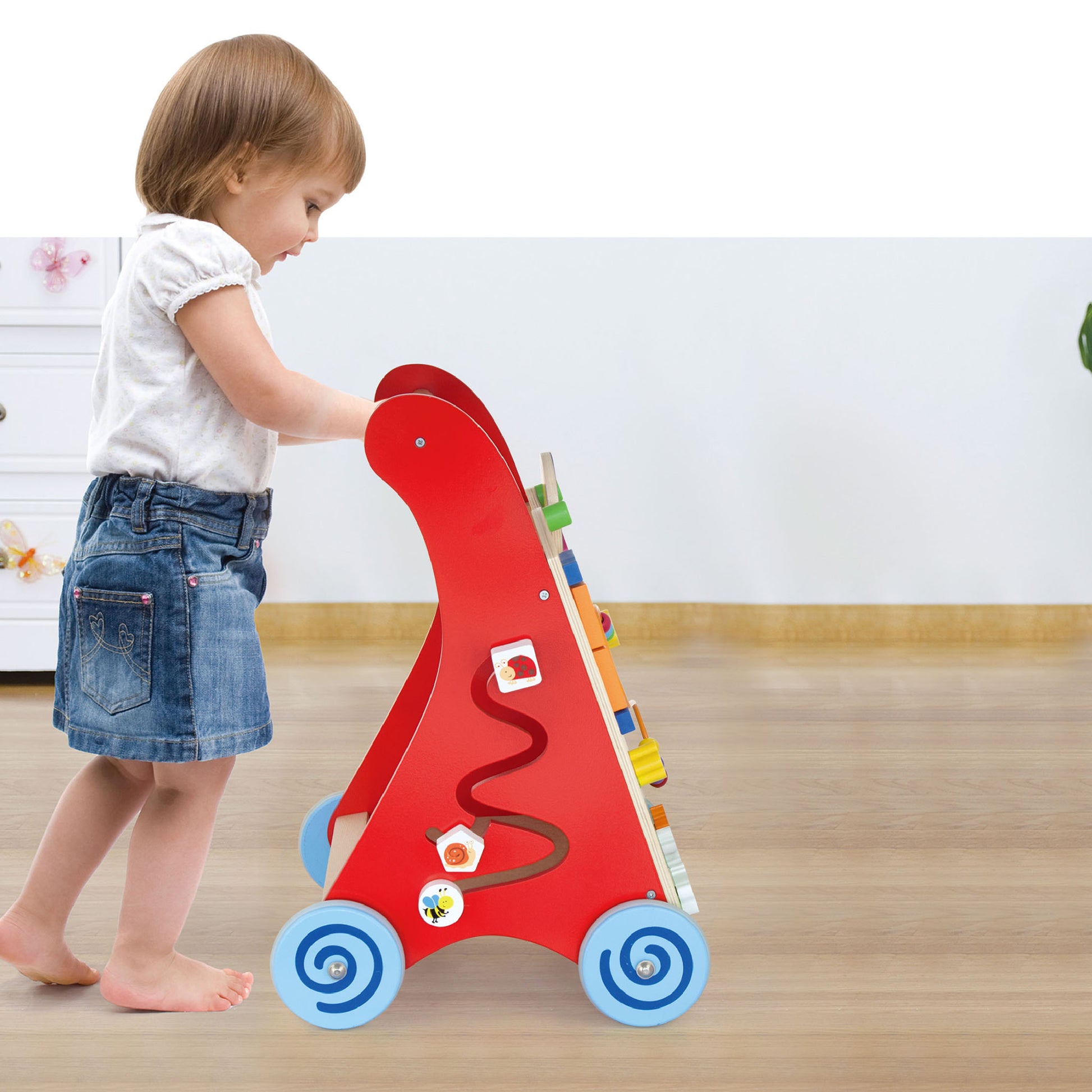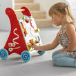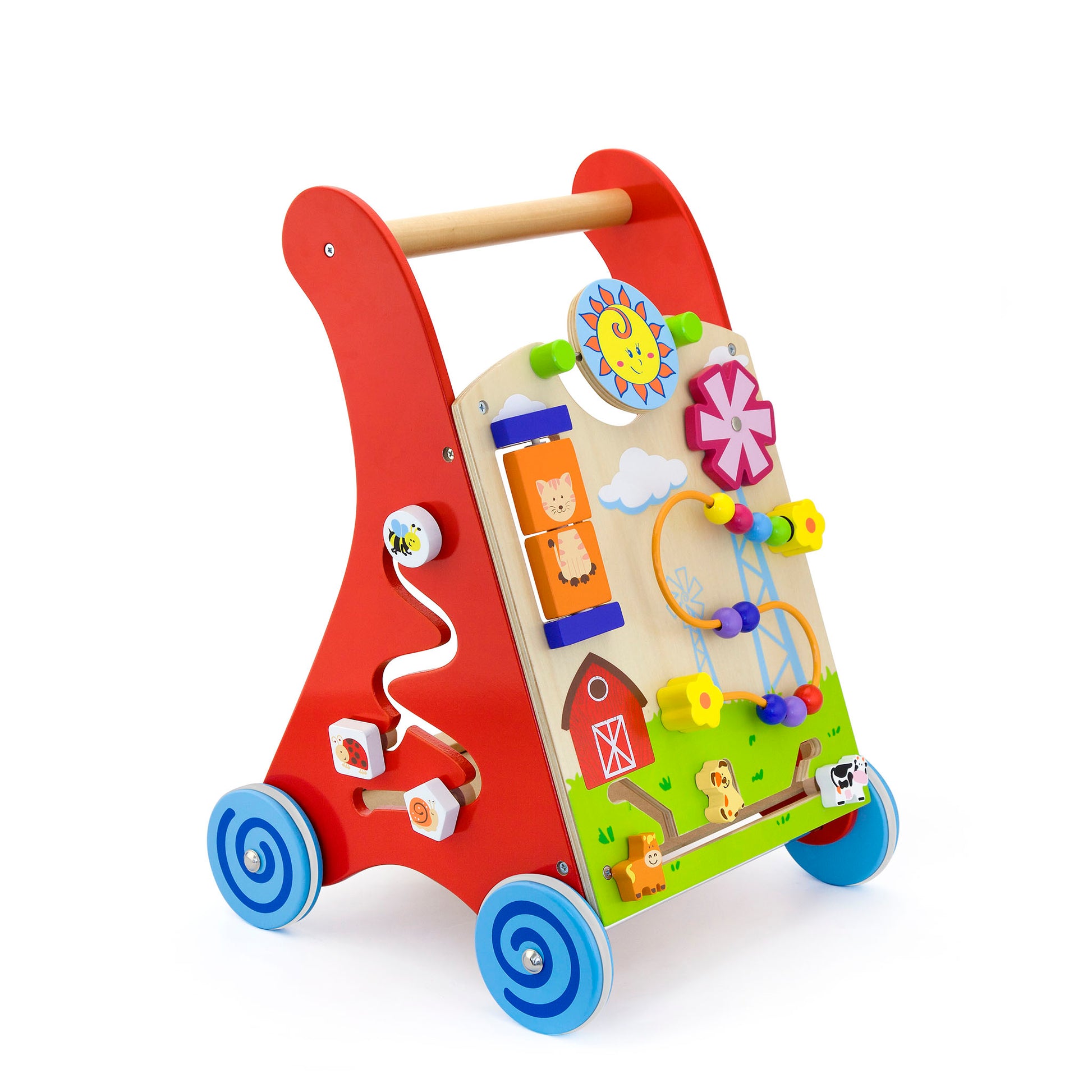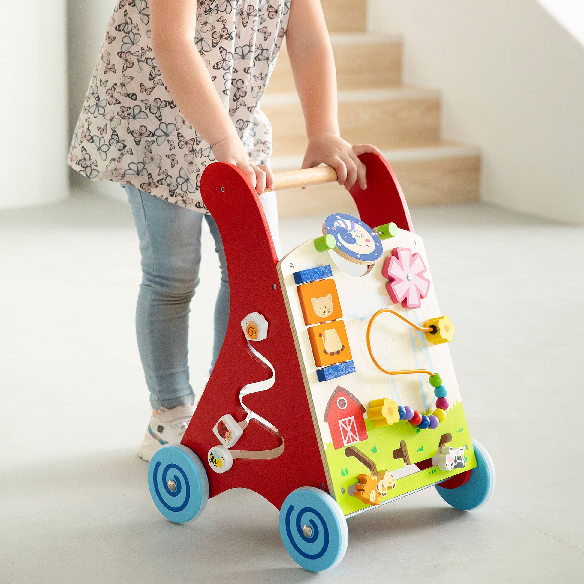 The walker features a farm animal track and trace activity, allowing children to explore and follow paths with their fingers, enhancing their fine motor skills and hand-eye coordination.