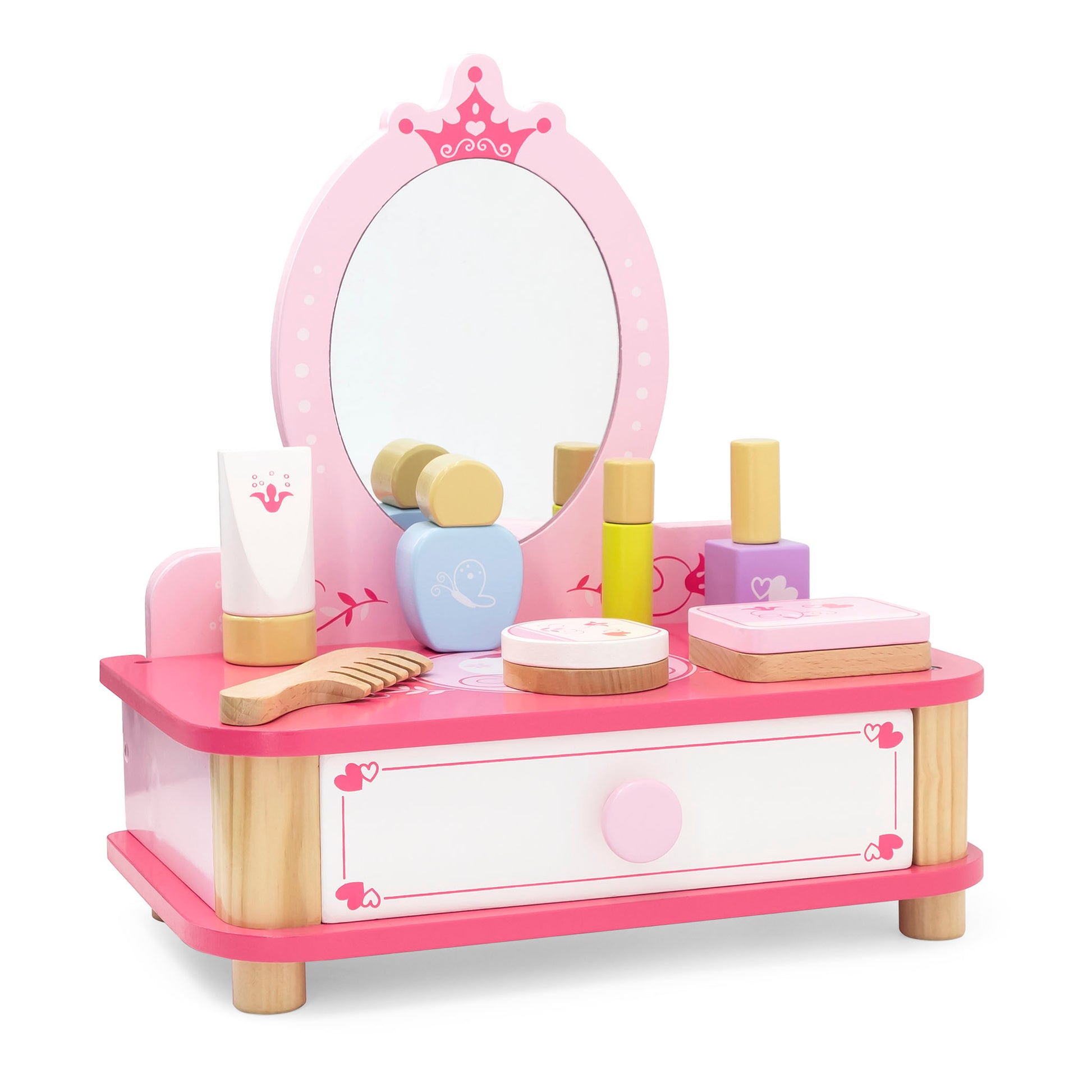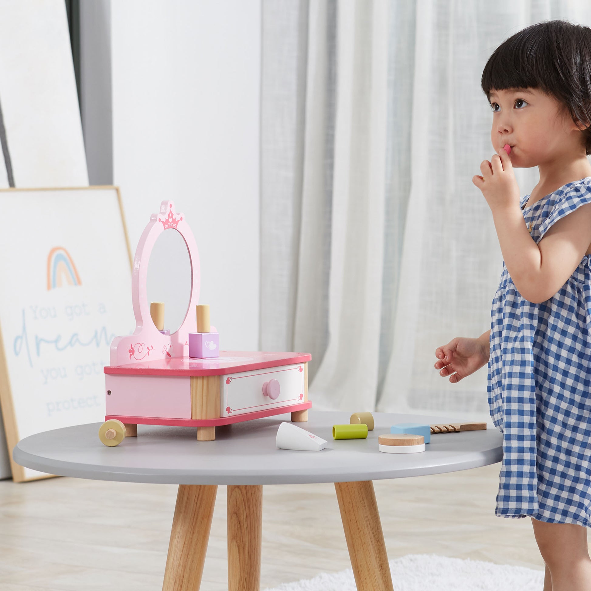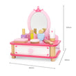 The set includes a charming wooden dressing table, complete with a beautifully crafted mirror that adds a touch of elegance to her playtime. With the pretend accessories included, such as wooden make-up and a wooden comb, your little one can engage in imaginative play, pretending to get ready for royal events and glamorous occasions.