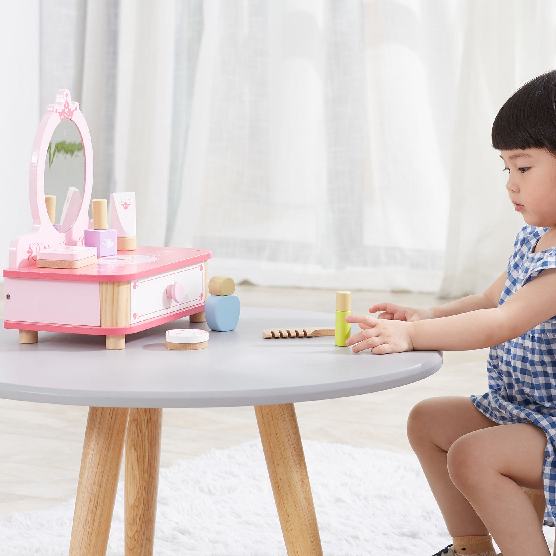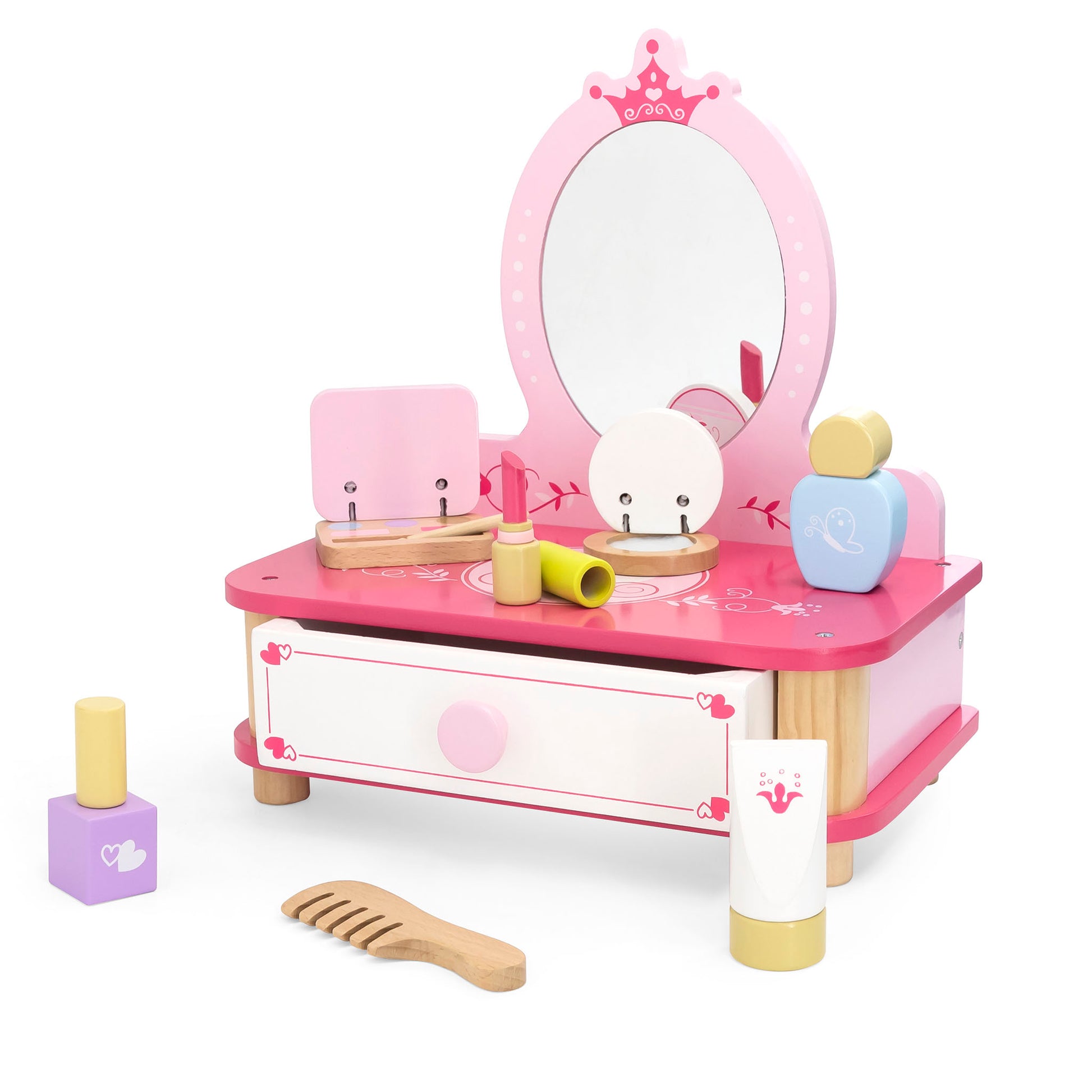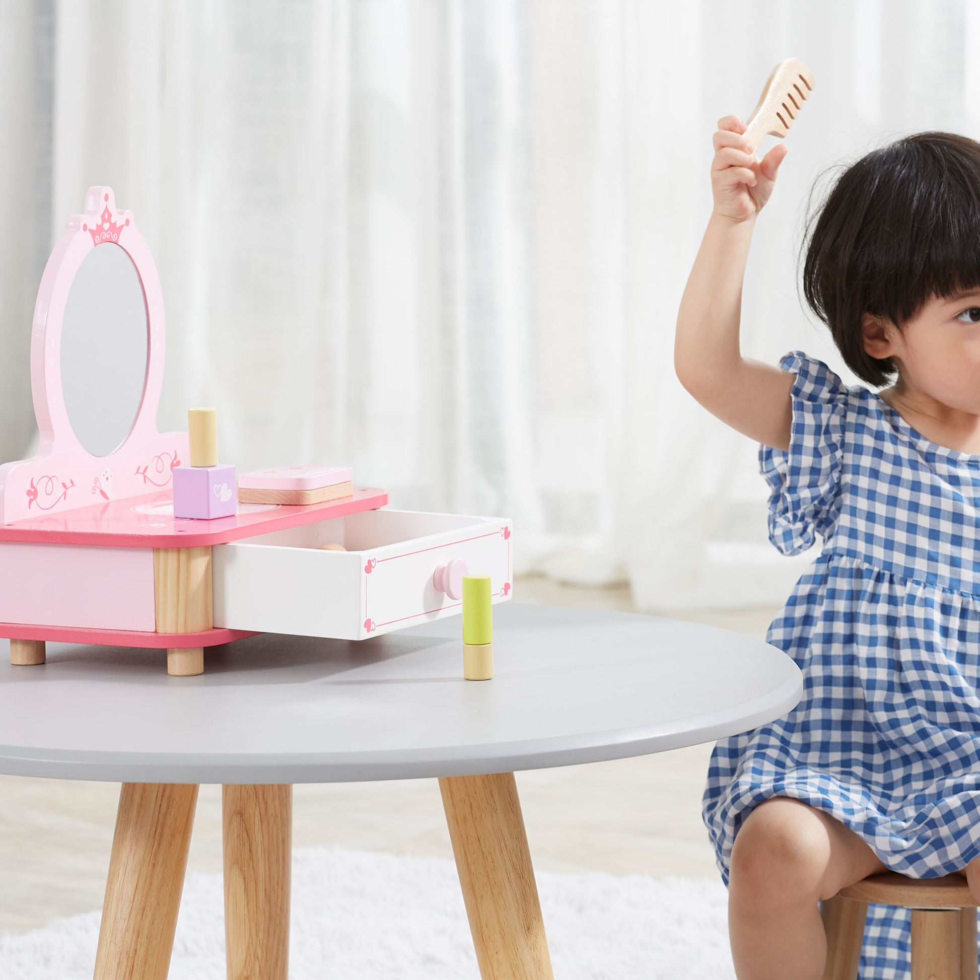 The dressing table features a practical pull-out drawer, providing a designated space for storing the pretend accessories and keeping everything organized. This not only adds to the authenticity of the play experience but also encourages tidiness and responsibility in your child.