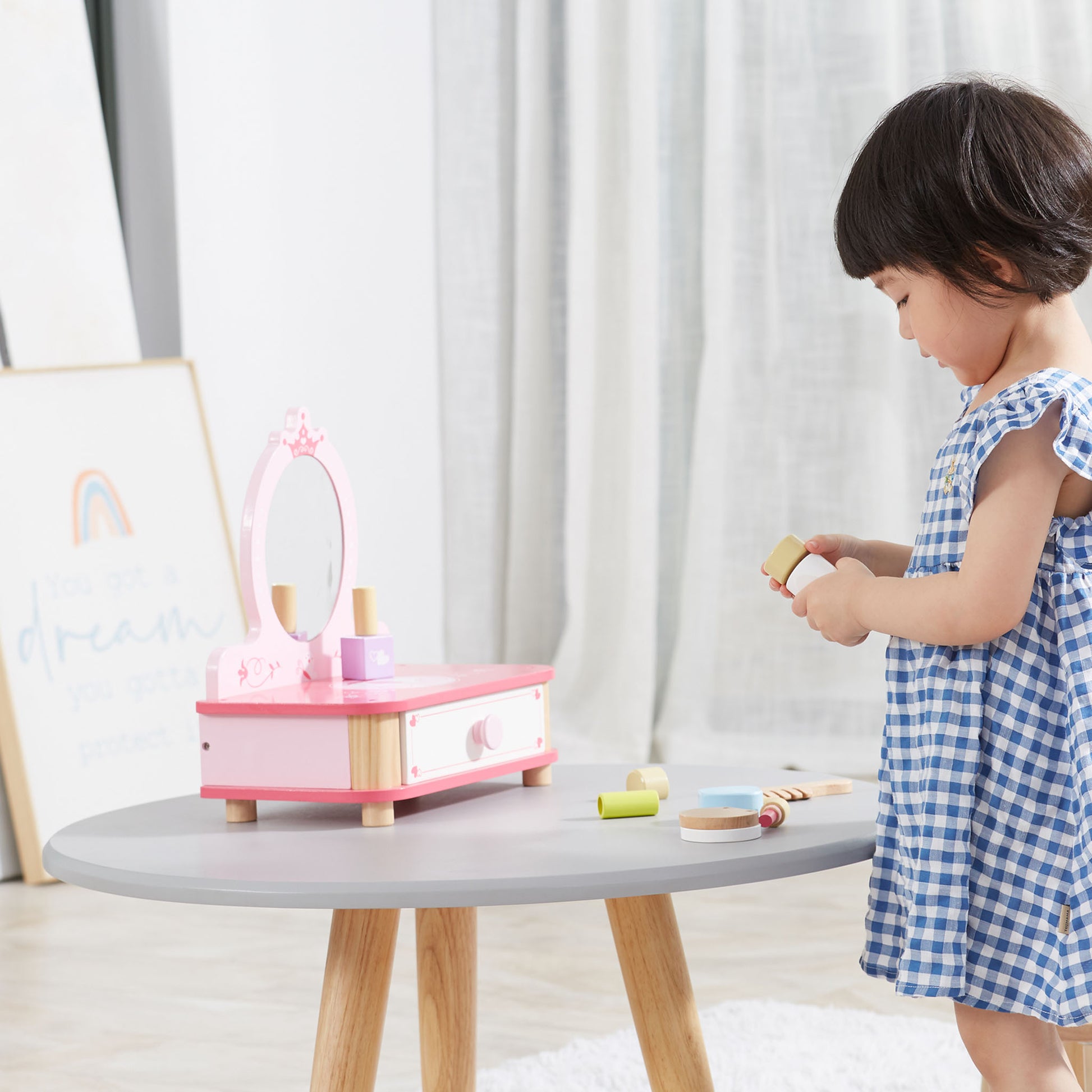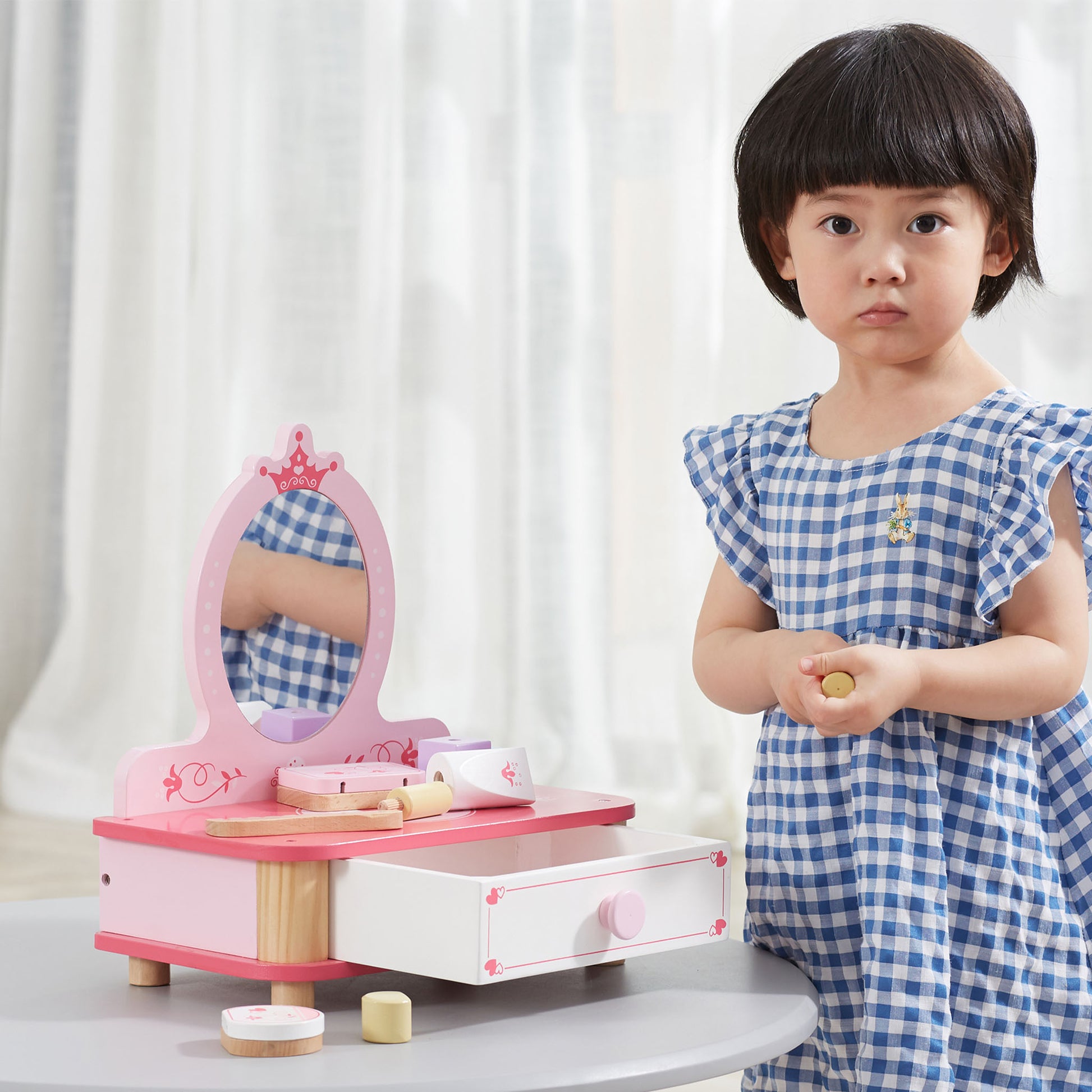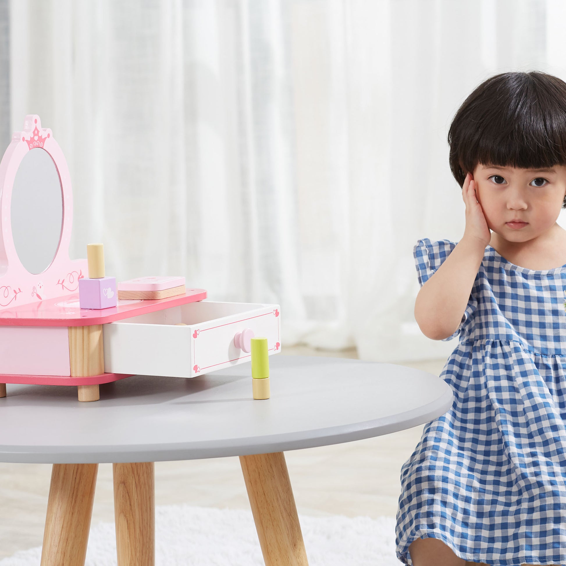 The dressing table features a practical pull-out drawer, providing a designated space for storing the pretend accessories and keeping everything organized. This not only adds to the authenticity of the play experience but also encourages tidiness and responsibility in your child.