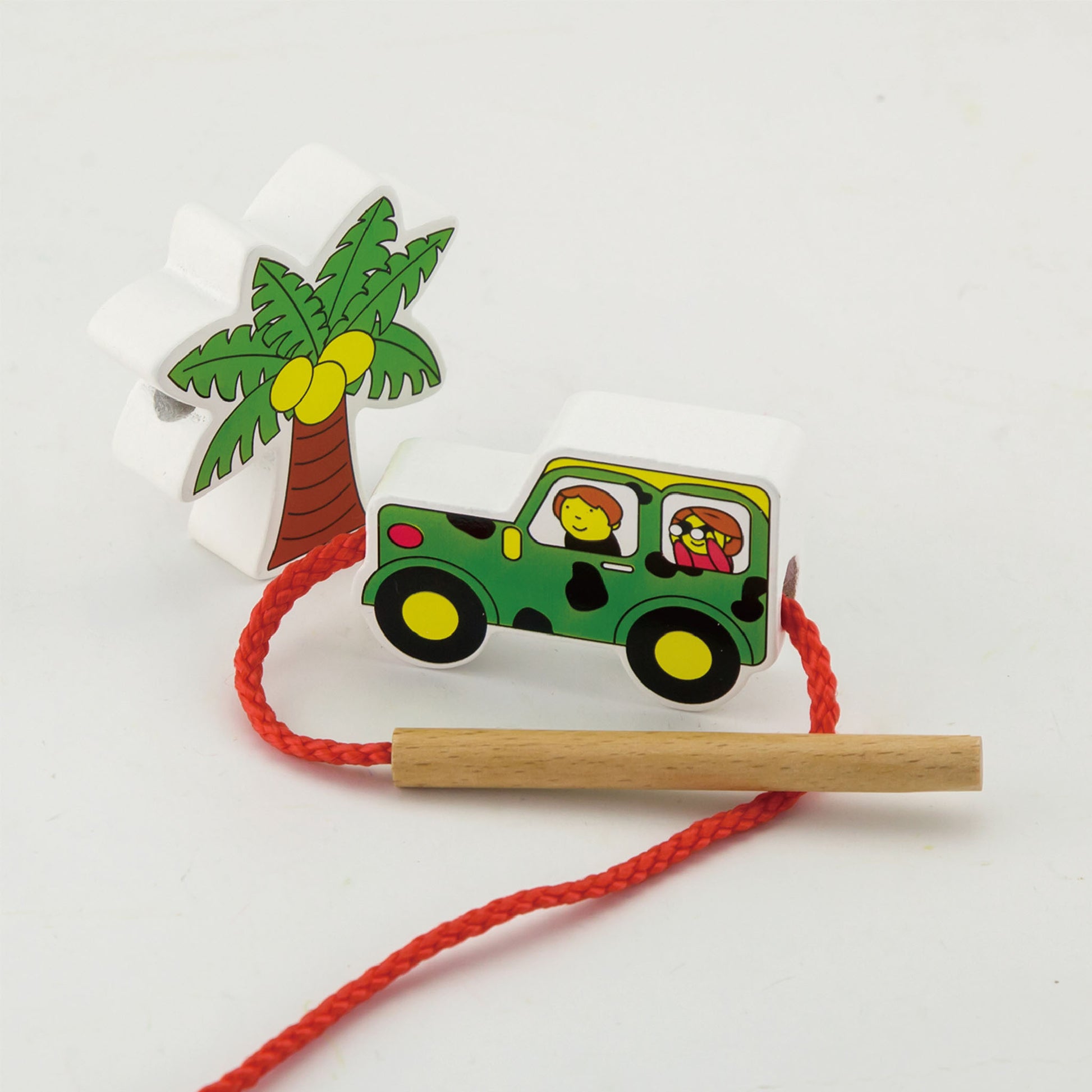 The lace is connected to a wooden bar, making it easy for small children to hold and manipulate. This promotes their hand-eye coordination and fine motor skills as they thread the lace through the designated holes on the blocks.