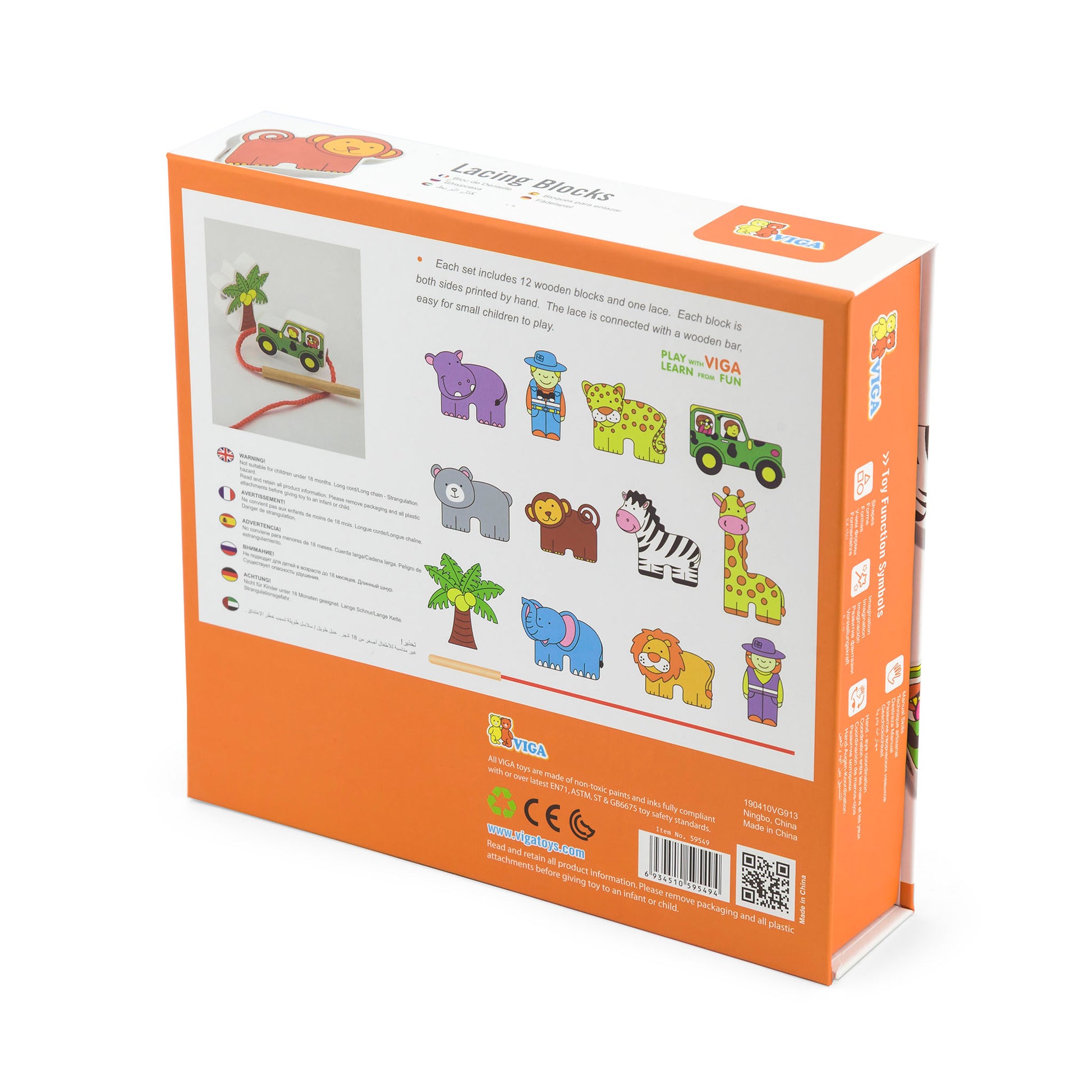 Each set includes 12 wooden blocks, featuring vibrant zoo-themed illustrations, and one lace with a wooden bar. The blocks are lovingly designed with hand-printed images on both sides, allowing children to explore a variety of zoo animals and scenes as they lace the blocks together.