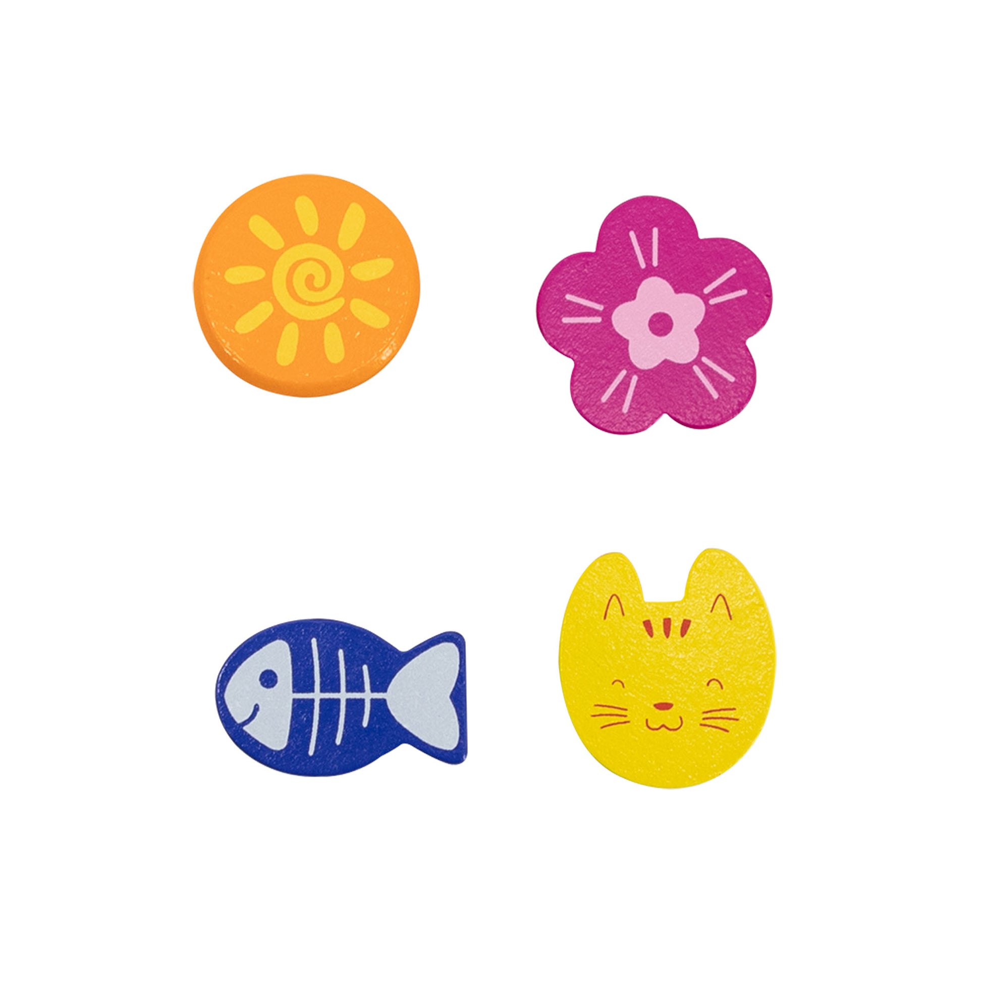 The set includes a train engine and multiple stacking blocks, each one featuring a different Learning Shape. Children can stack the blocks in different orders to create unique train cars, stimulating their imagination and problem-solving skills. The blocks are printed by hand, adding a personal and artistic touch to each piece.