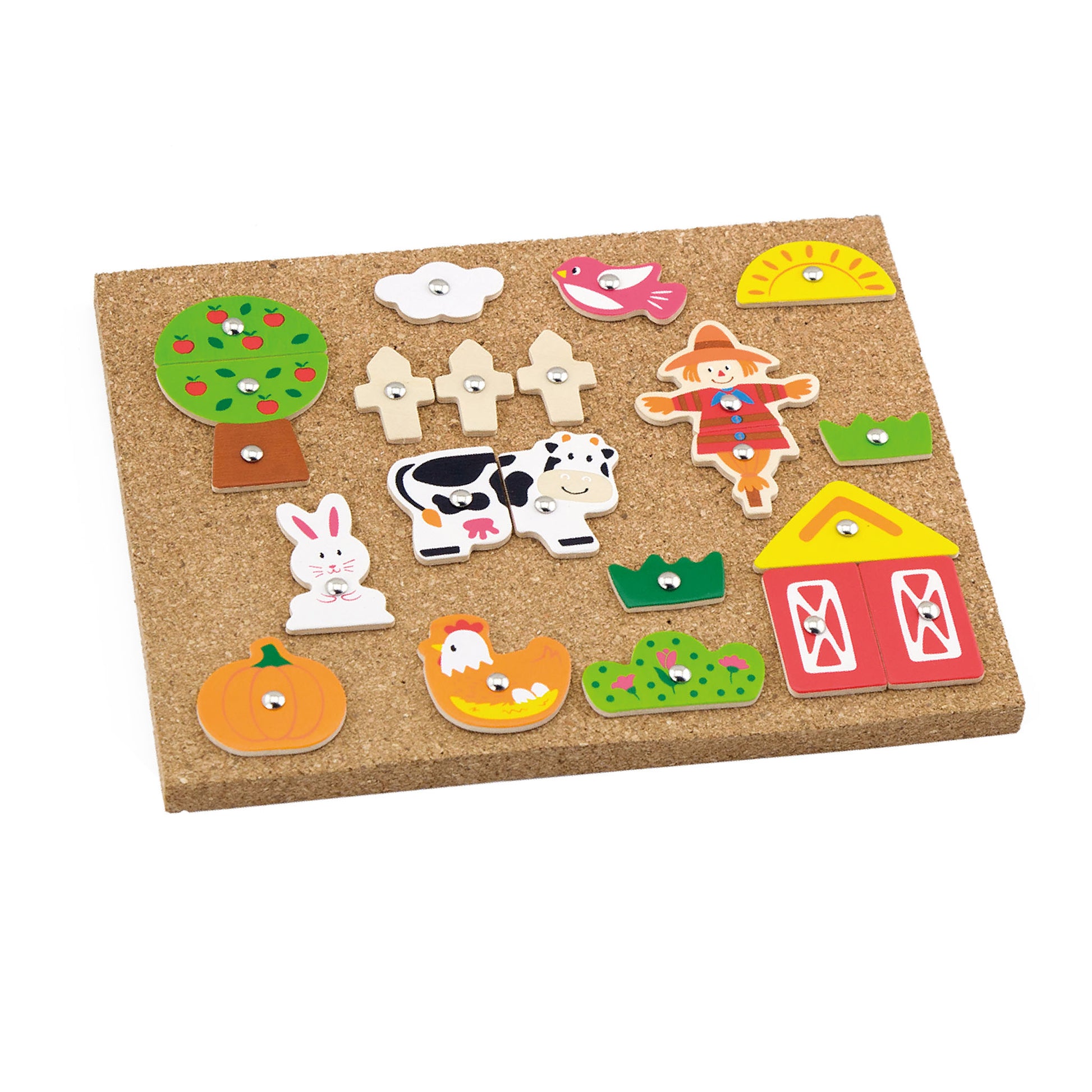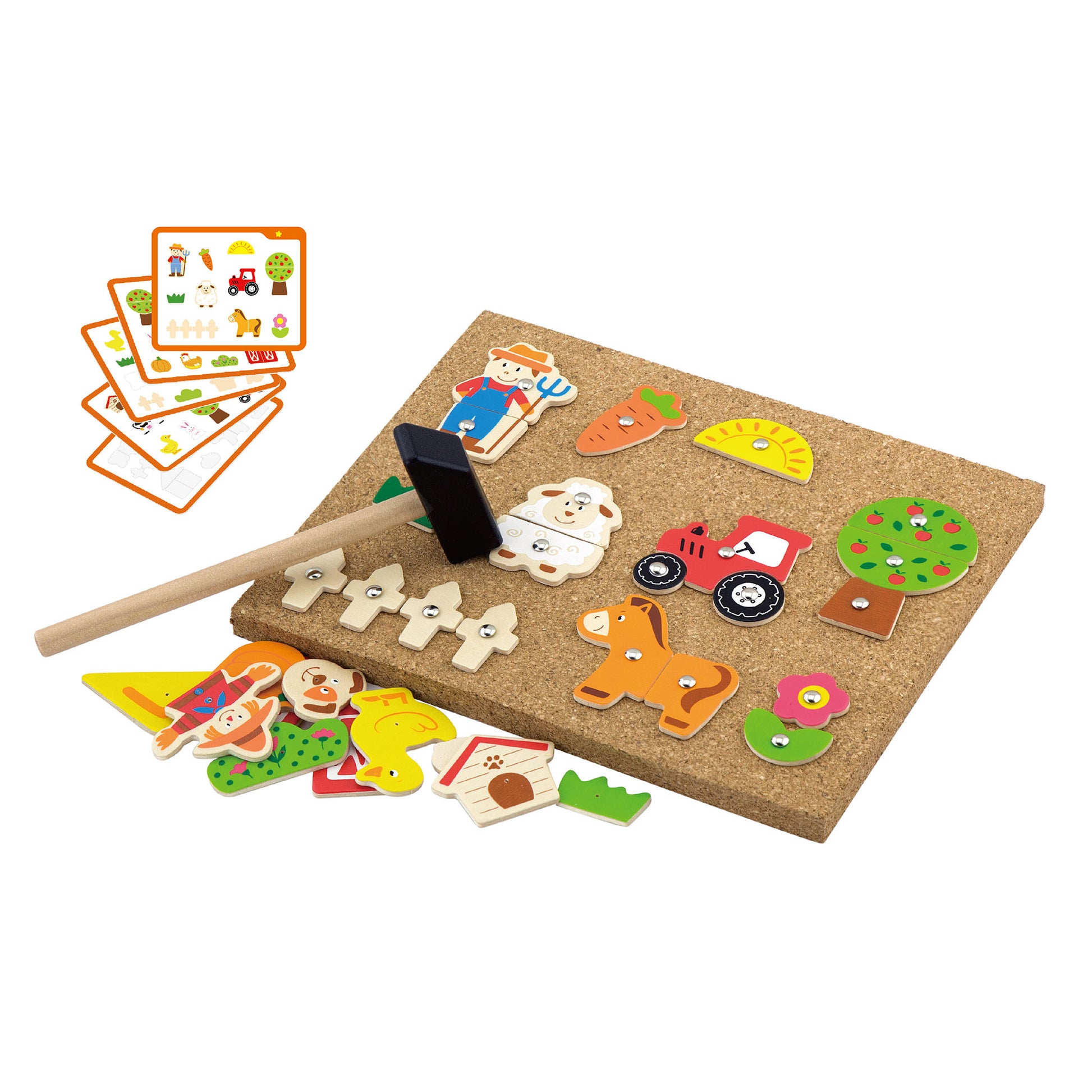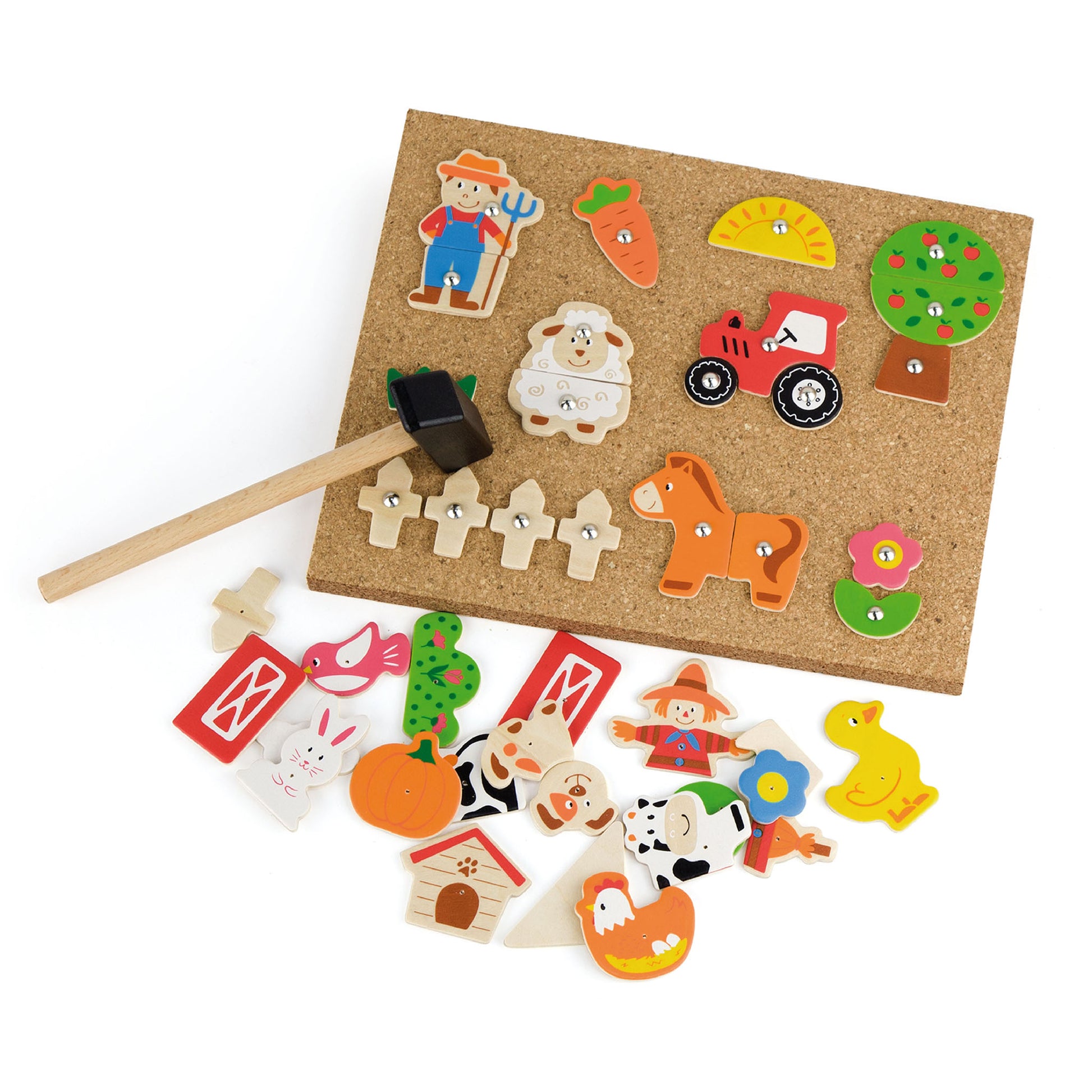 With 24 different elements representing various farm elements such as a farmer, a barn, a tractor, animals, and plants, children can create their own farm scenes on the cork board. The wooden figures can be securely attached to the board using the provided tacks and the hammer.