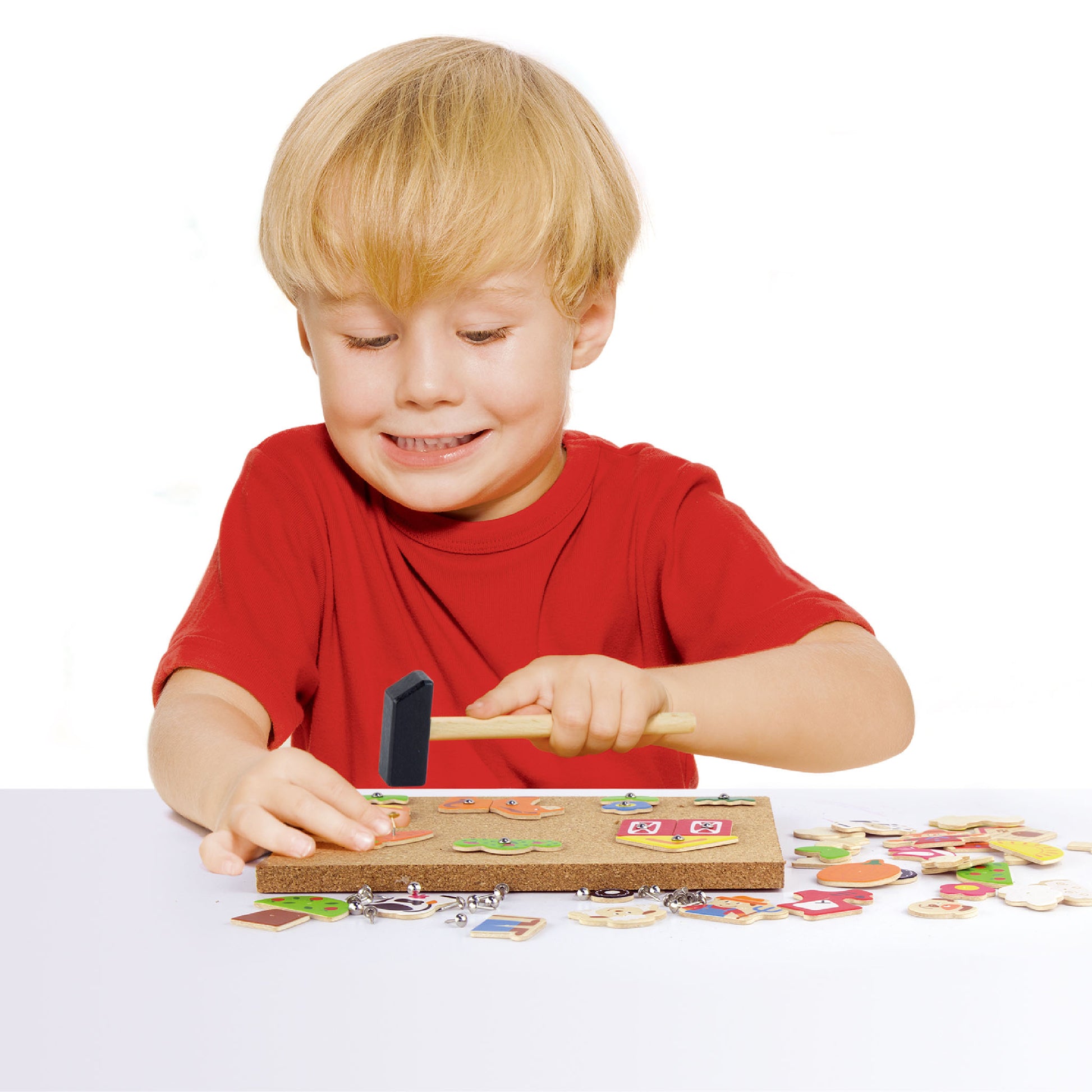 As children engage in the Tack Zap Farm play set, they develop their fine motor skills as they use the hammer to tap the tacks into the cork board. This activity requires hand-eye coordination, precision, and control, promoting the development of their dexterity and finger muscles.