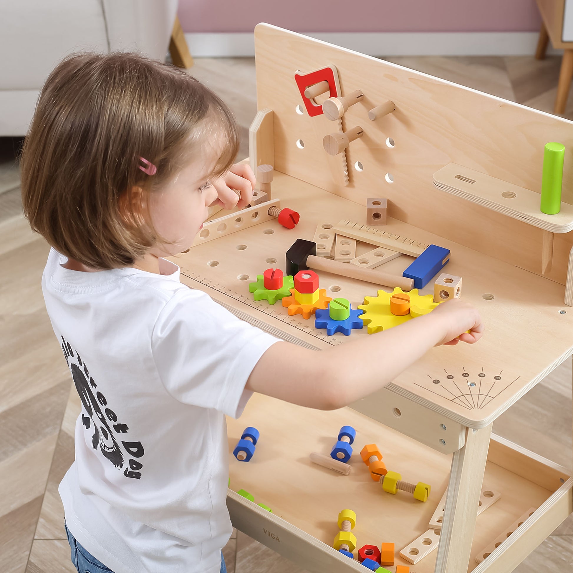 Engaging with the Tool Bench helps children develop their fine motor skills as they grasp, manipulate, and manipulate the tools and accessories. They also exercise their cognitive skills and logical thinking as they plan and execute their building projects. This process enhances their spatial awareness, hand-eye coordination, and attention to detail.