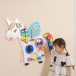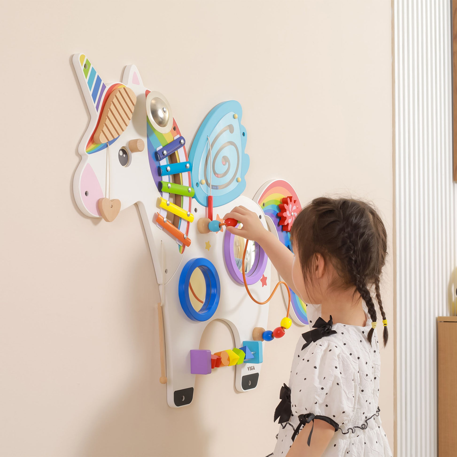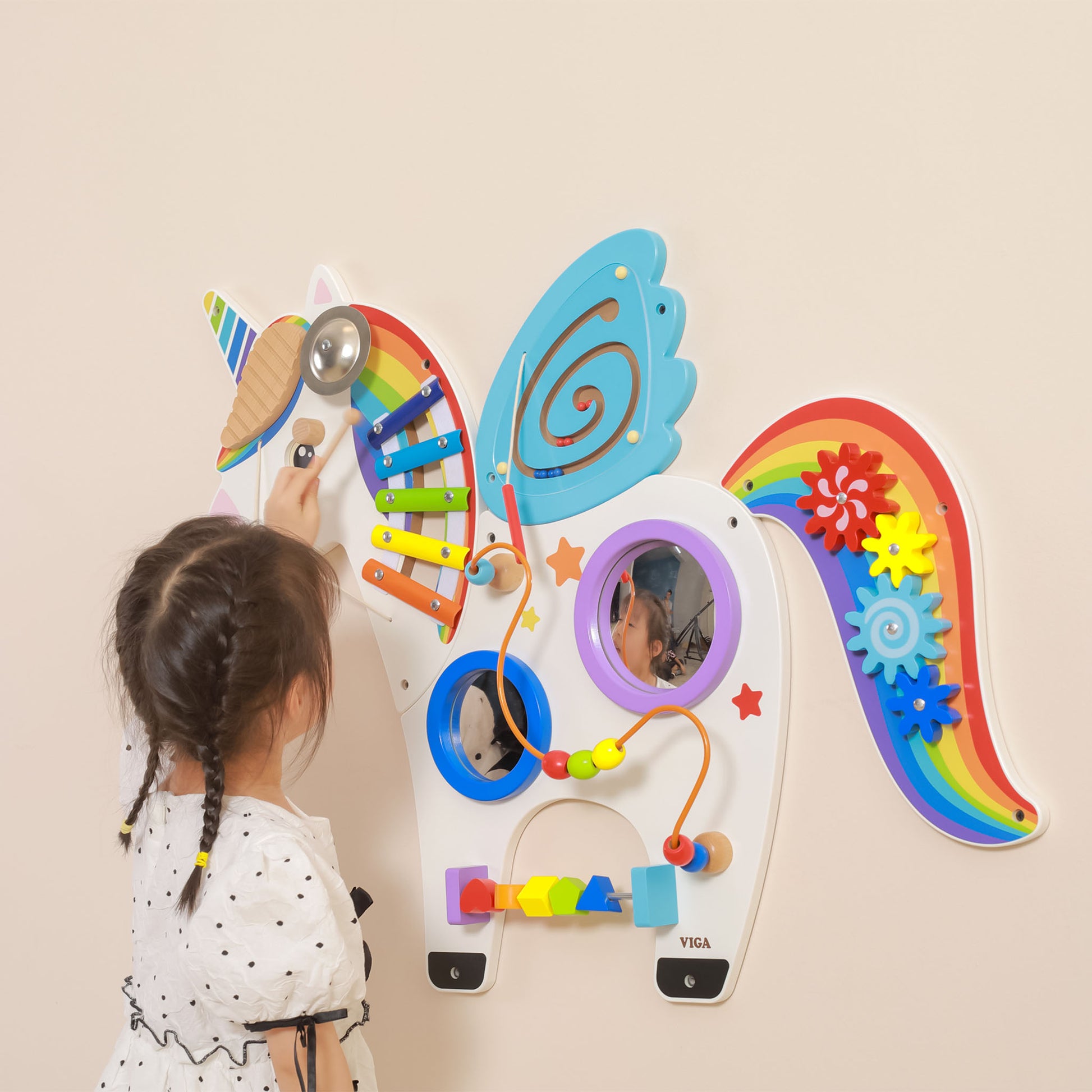 This beautifully designed unicorn wall toy includes popular features such as turning gears, wire beads, xylophone, concave and convex mirror, gong, etc.