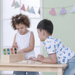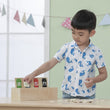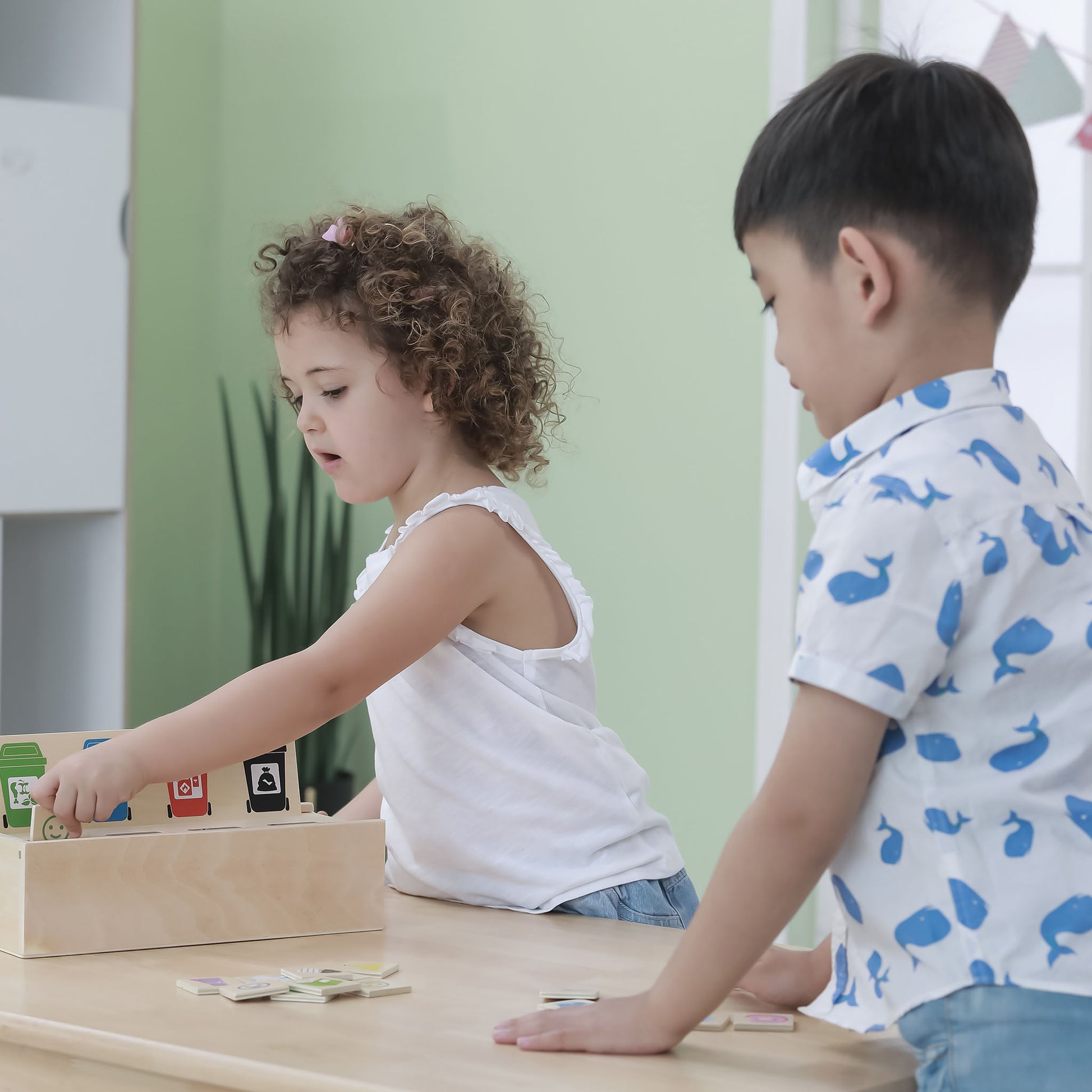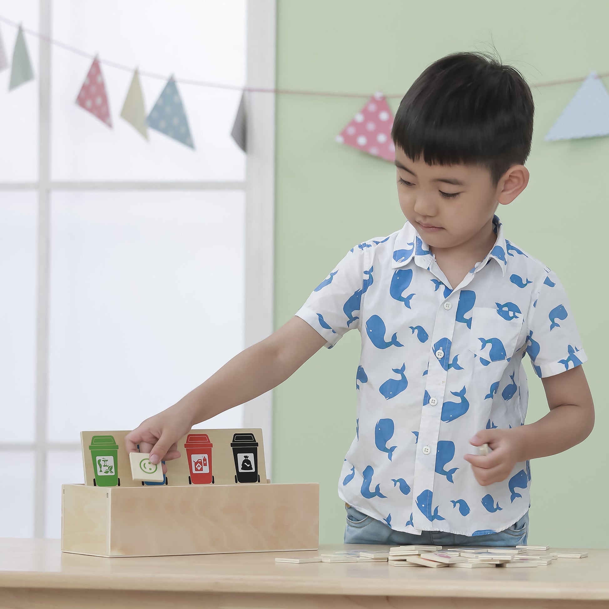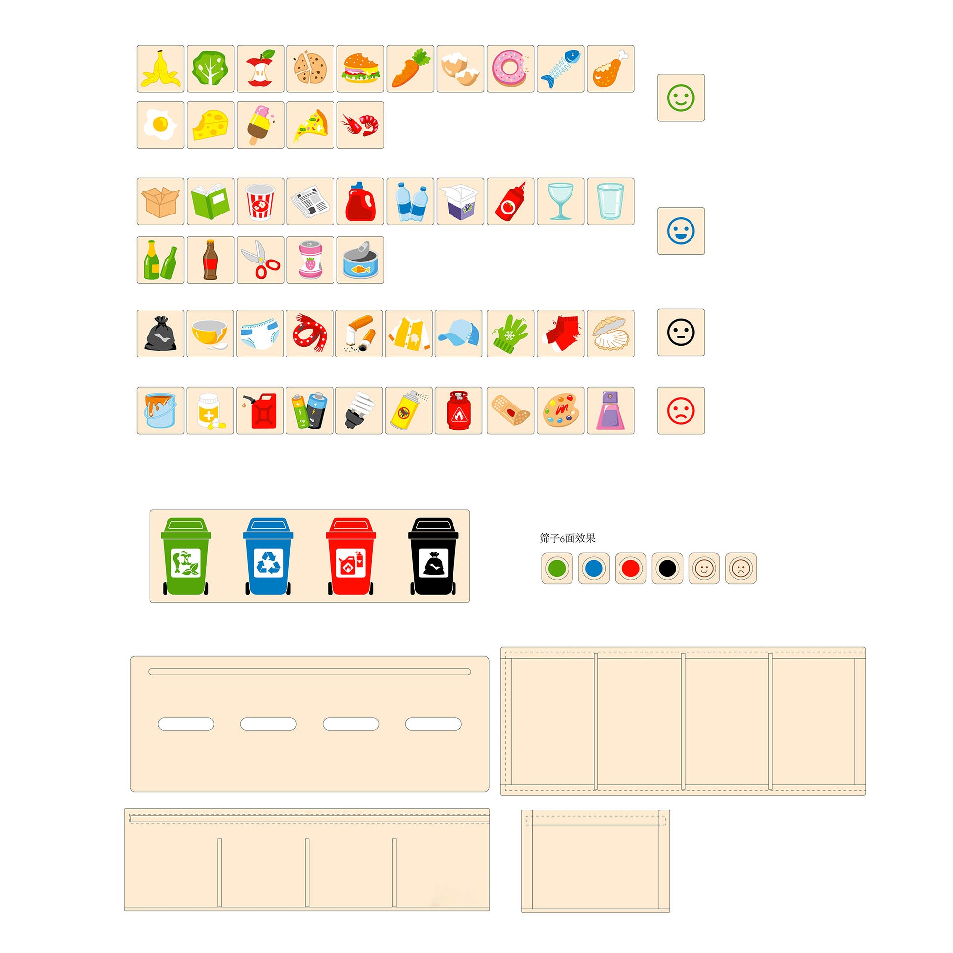 On the back side of the blocks or cards, there are corresponding colors that match the colors of the bins. This allows children to self-check their sorting accuracy by comparing the colors of the blocks/cards with the colors of the bins. If the colors match, it indicates that the waste has been correctly classified.