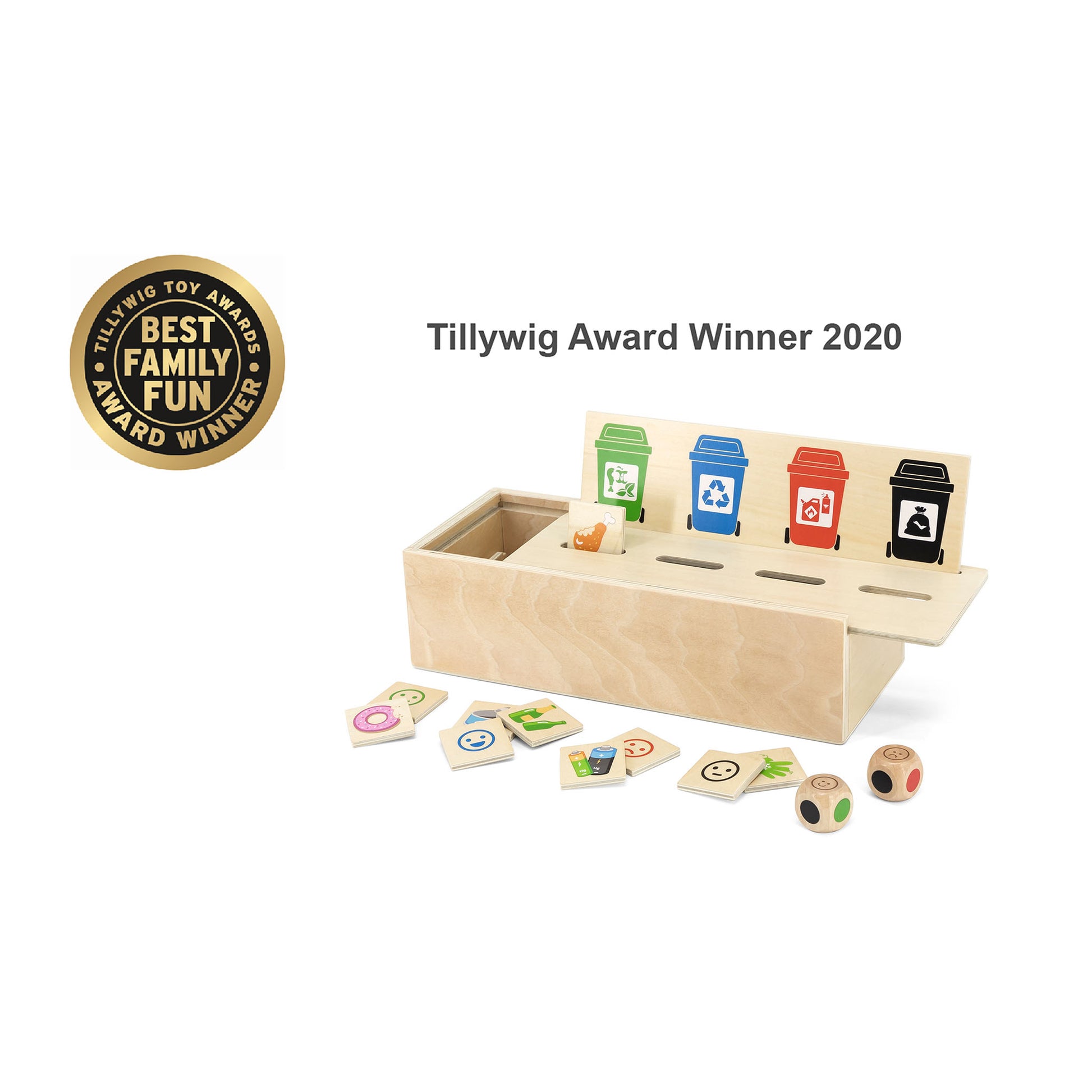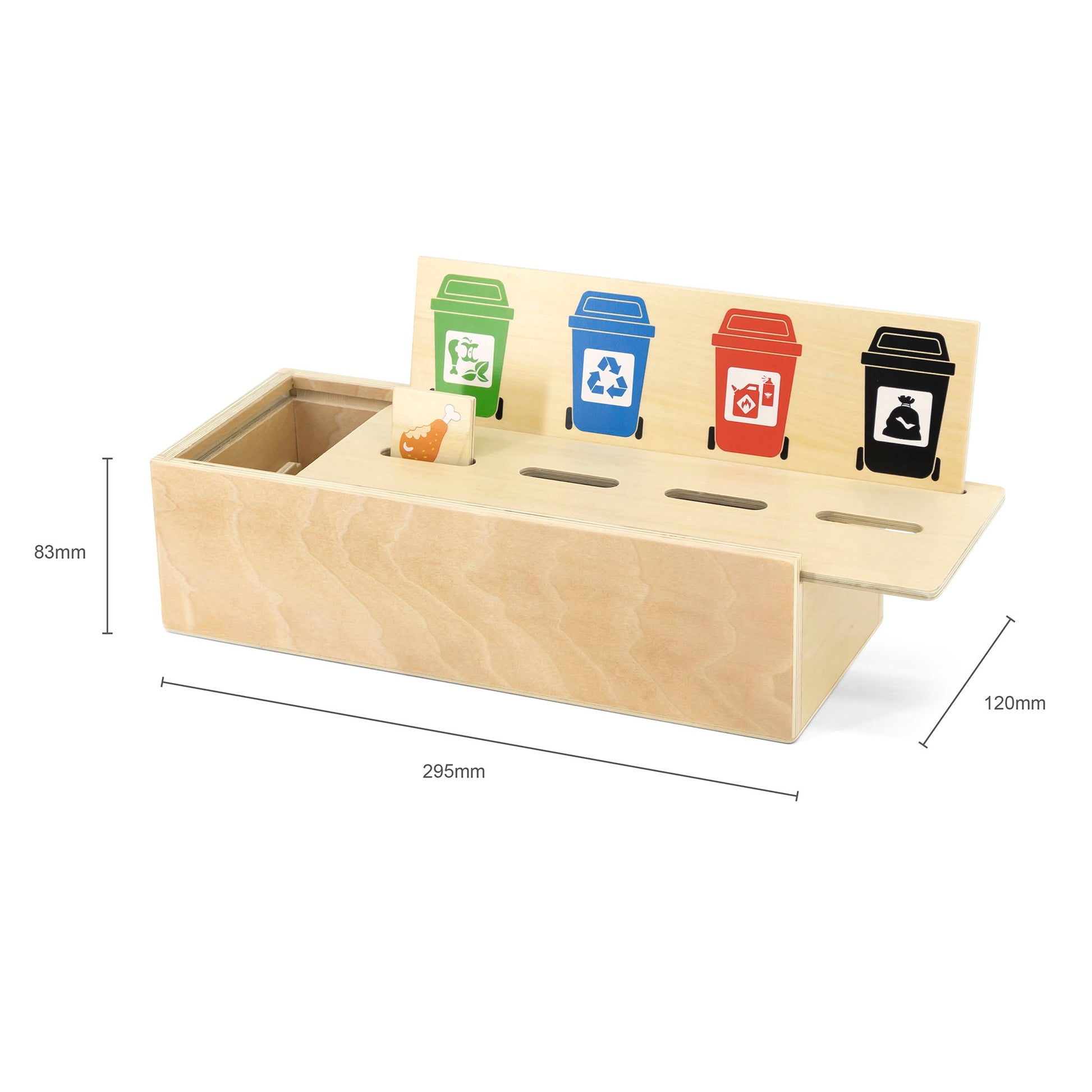 The toy consists of four bins, each representing a specific waste category, such as recyclables, organic waste, paper waste, and general waste. The bins are labeled and color-coded to help children identify and differentiate between the waste categories.